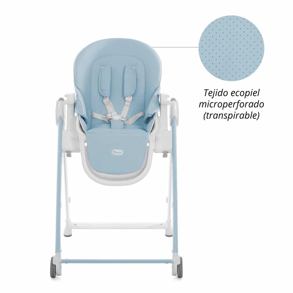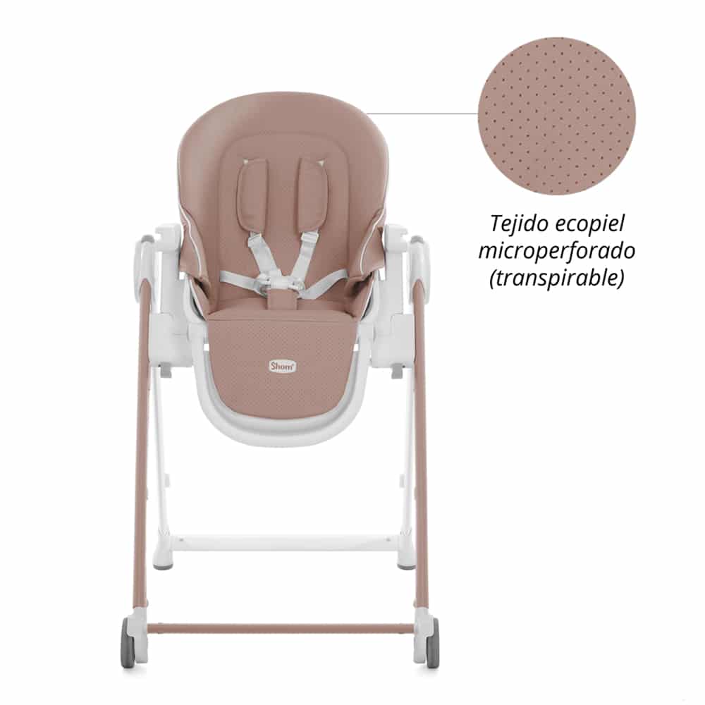 Trona SHOM CHESTER 2.0 de Baby Essential, tapizado en piel ecológicatranspirable acolchado, muy cómoda para tu bebé. Con diferentes alturas y posiciones de reclinado. Incluye 2 ruedas delanteras para moverla fácilmente. Arnés de 5 puntos. La bandeja una vez plegado se sujeta en la estructura de la trona. Reposapiés regulable. 5 colores a elegir